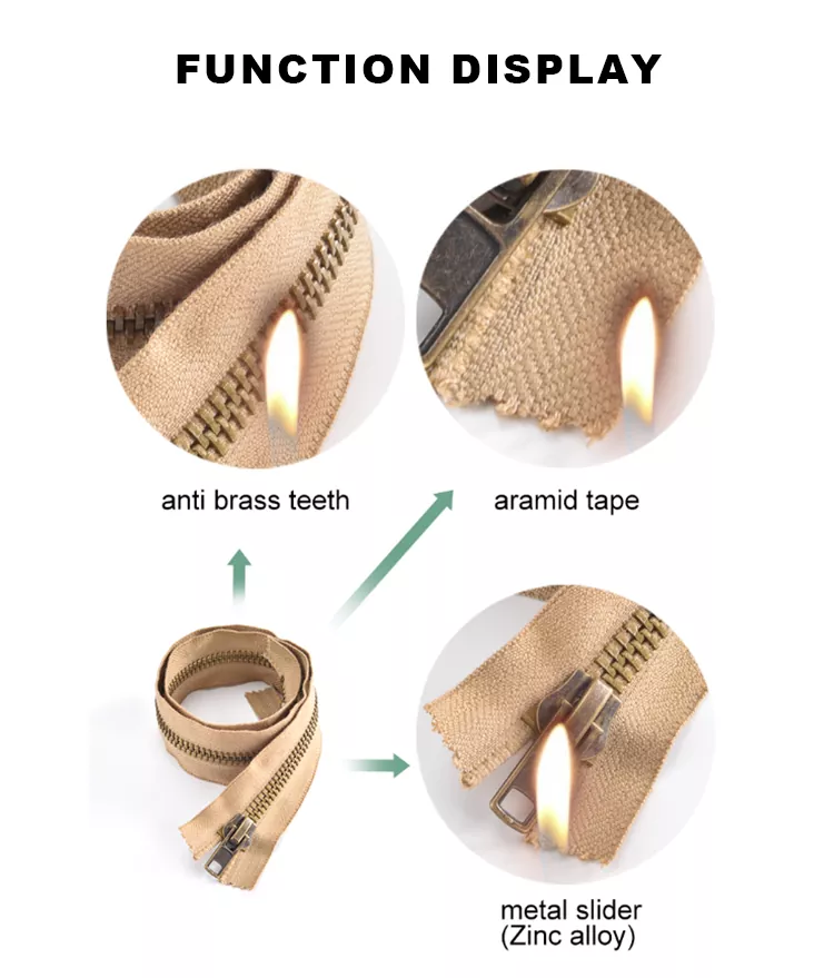 La cremallera metálica resistente al fuego TRC utiliza cinta ignífuga con propiedades autoextinguibles, lo que evita que se quemen o se incendien en el aire, combinando seguridad y durabilidad. Su excelente resistencia al calor garantiza que incluso cuando se exponga brevemente a altas temperaturas de 300 °C, no se encoja, se vuelva quebradizo ni se derrita, lo que lo convierte en una opción ideal para aplicaciones de alta protección.