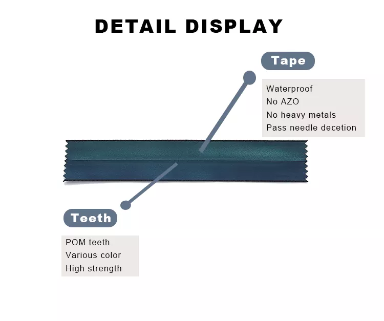 La cremallera de plástico impermeable TRC utiliza dientes de plástico de alta calidad y un proceso de revestimiento impermeable profesional para garantizar una superficie lisa y un sellado hermético, evitando eficazmente la penetración de humedad y garantizando un rendimiento óptimo de la ropa y el equipo en condiciones de humedad.